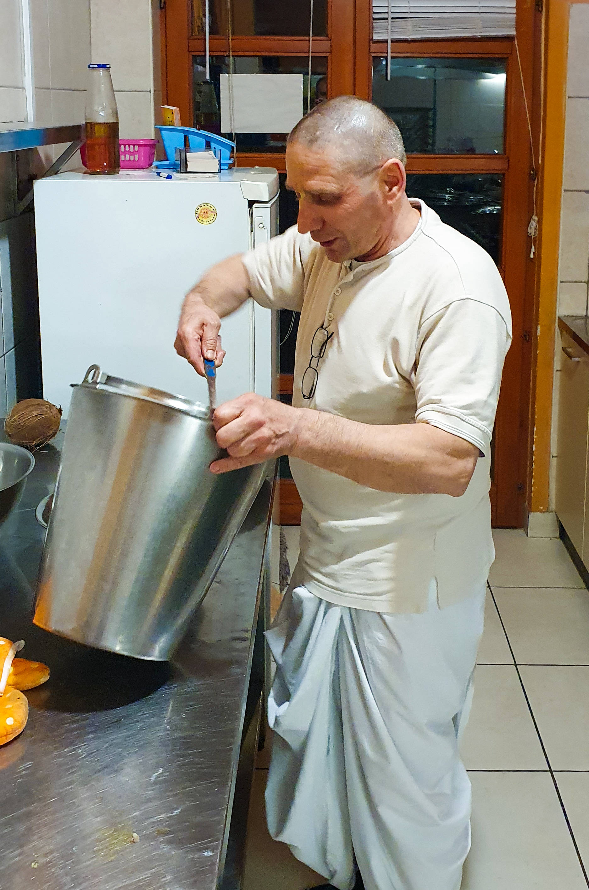 Dhanvantari d za redovno čišćenje kuhinje i pomaganje oko pripreme prasadama te doniranje dobrog dijela bhoge za pravljenje istog.