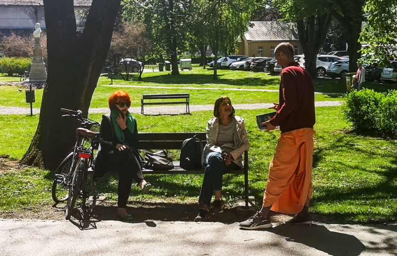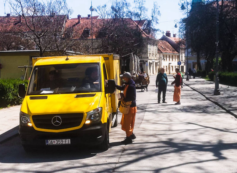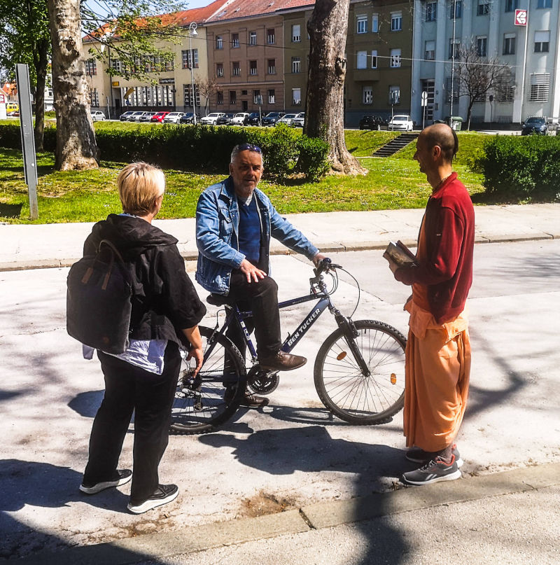 Svakodnevna Srimad Bhagavatam predavanja uživo online preko Facebook stranice hrama urodila su plodom. Naime, jedan naš pratitelj, Mirel, javio nam se porukom da nas želi pobliže upoznati i postati Hare Krišna. Vaikuntha-murti das i bh. Gauranga nedugo nakon toga Mirelu su pokucali na vrata. Domaćin je ponizno postavljao pitanja i zapisivao odgovore u bilježnicu. Bhakte su ga naučili osnovama prakticiranja svjesnosti Krišne kod kuće; Kako se mantra na brojanici, nudi hrana Gospodinu i u koja sve doba dana slaviti gurua i Gaurangu. Bh. Mirel je kupio Bhagavad-gitu i brojanicu te dao prekrasnu donaciju svježeg voća i povrća za Šri Šri Gaura Nitai. Molimo sve Vaišnave koji ovo čitaju da bhakta Mirela obasipaju svojim blagoslovima za što uspješnije napredovanje u duhovnom životu svjesnom Krišne!