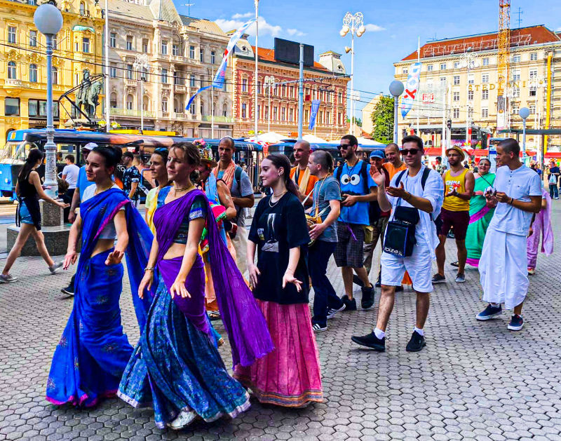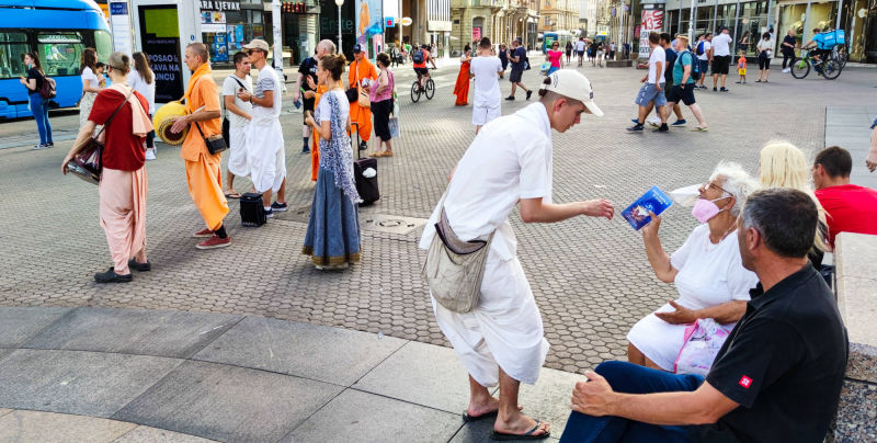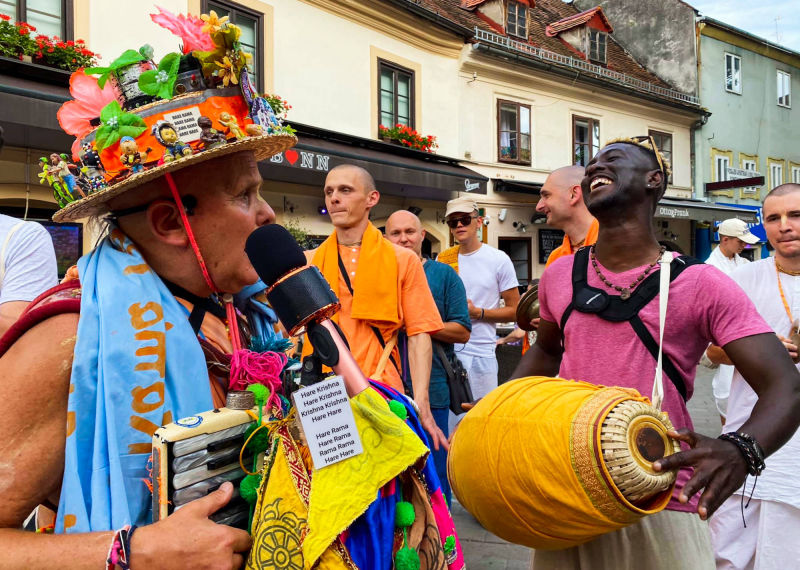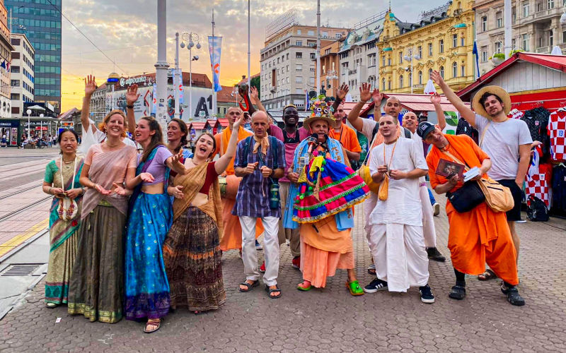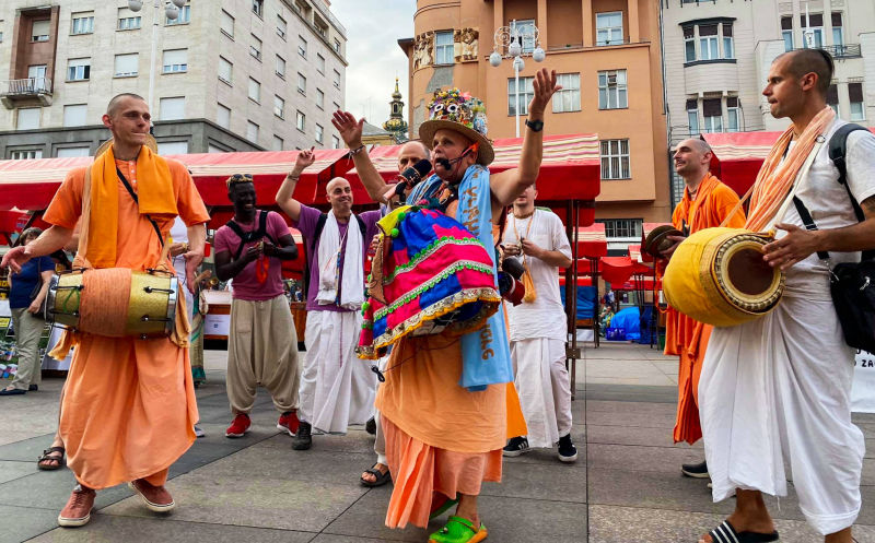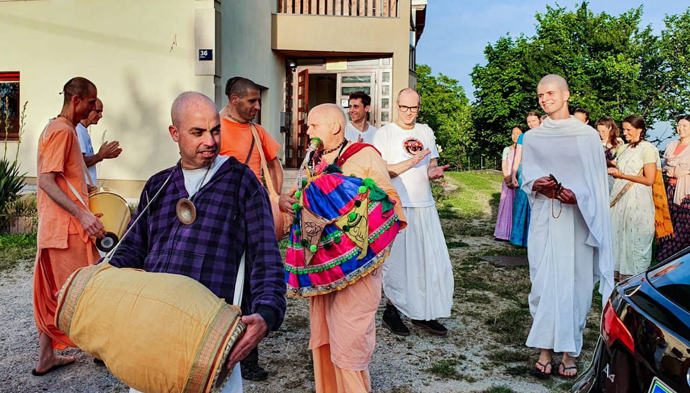 Nakon dugo vremena, planetarno poznata 'Harinama Ruci' putujuća skupina, predvođena Visnujana dasom iz Slovačke, ovoga puta posebno opunomoćena prisustvom Njegove Svetosti Maha Visnu Swamija, posjetila je Zagreb i boravila u hramu. Osim Maharaja i Visnujana, ostatak ekipe činilo je još dvoje bhakta - bhakta Vedran iz Splita (sin mataji Ekangini) i Jivananda das iz Slovačke. Osjećamo se posebno zahvalnim na neprocjenjivom kirtan iskustvu s Maharajem te divnim predavanjima koje je održao u dva navrata. Za vrijeme njihovog boravka održali smo tri zajednička harinama u kojima smo podijelili preko 100 knjiga!