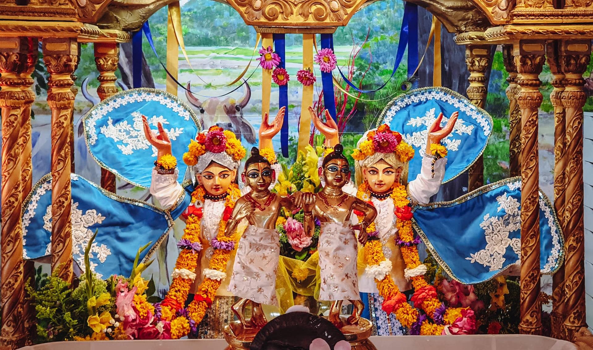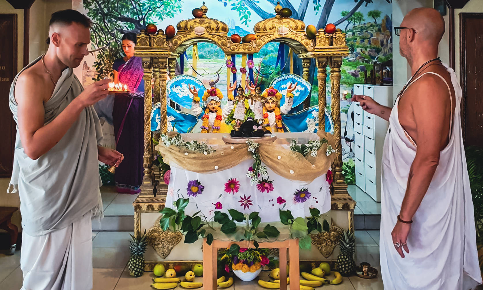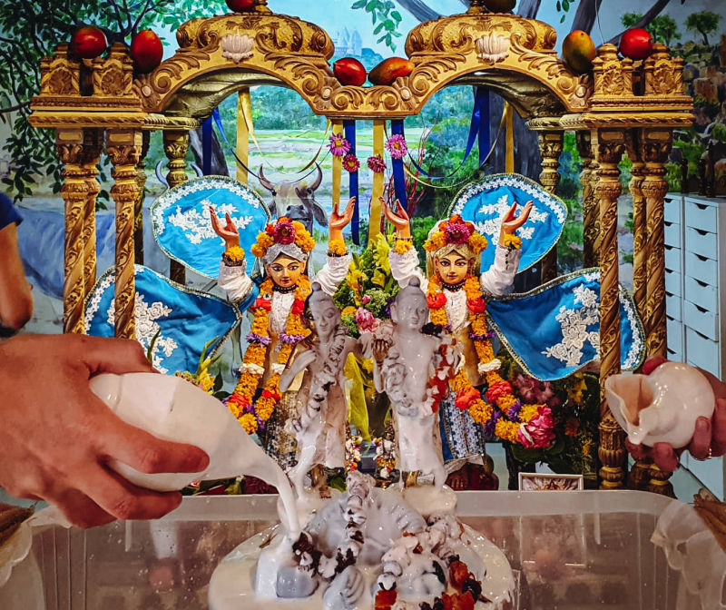 Od ranog jutra, Gaura-mitra d, Nrsingha-lila dd, Fani, Gita (kćer bh. Zorana Crnčevića), Emily i Karmen, ukrašavali su hramsku prostoriju, dok su u kuhinji, Vraja Mandali Priya dd, Vaikuntha-murti d i bh. Mario Jukić, pripremali rođendanske ponude Gospodinu. Za prekrasno novo odijelo za Gaurangu i Nityanandu pobrinula se Krsna-rupini devi dasi koja je na njemu radila čak godinu dana!