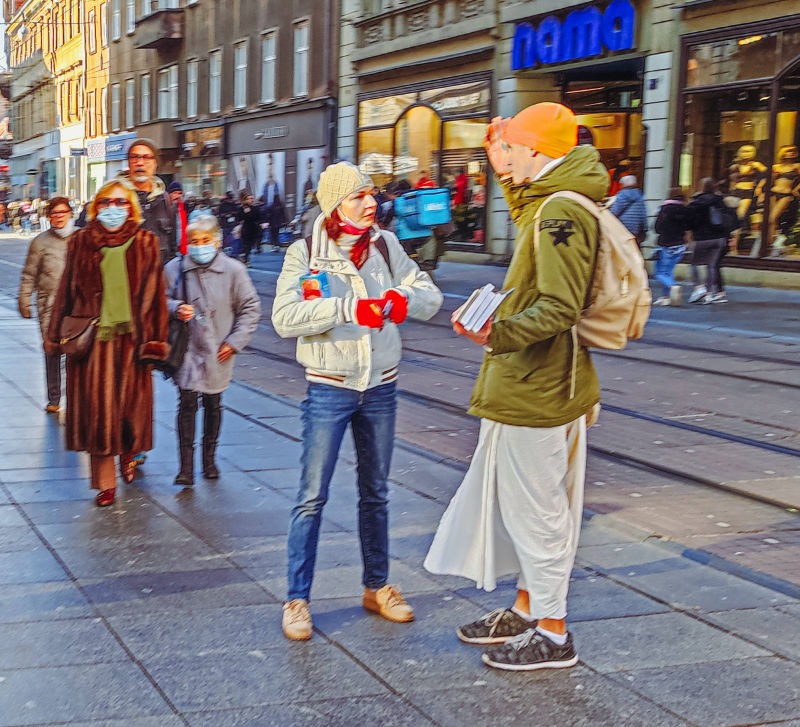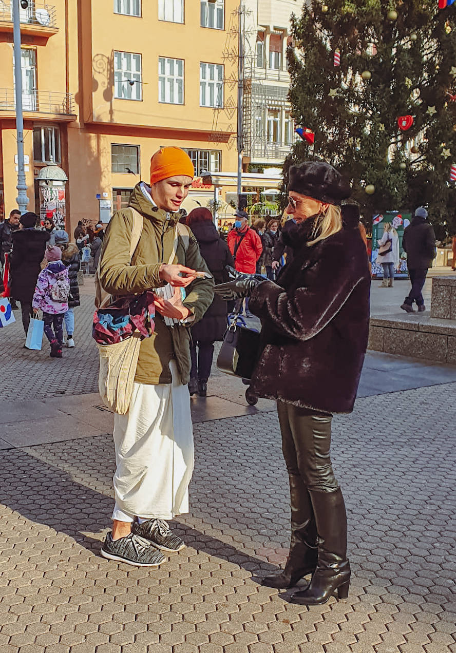 Tako je taj hodajući „ured“, odnosno Lomancita das, jedne subote prišao gospodinu Tihomiru i ponudio mu knjige, a ovaj ih je radosno prihvatio i uzvratio donacijom. Osim knjiga, Lomancita je Tihomiru uručio i osobni poziv na neko od naših druženja u hramu, na što je ovaj odgovorio da će razmisliti. Nije dugo trebao razmišljati, jer mu je nakon samo nekoliko minuta prišla i bhn. Kristina koja mu je, pogađate, ponudila knjige. Njezina ponuda knjiga ovaj put nije prošla, ali je prošao njezin osobni poziv na druženje s bhaktama. Tihomiru nije trebalo puno da shvati, kako mu je suđeno doći na program.