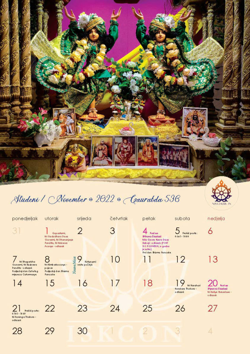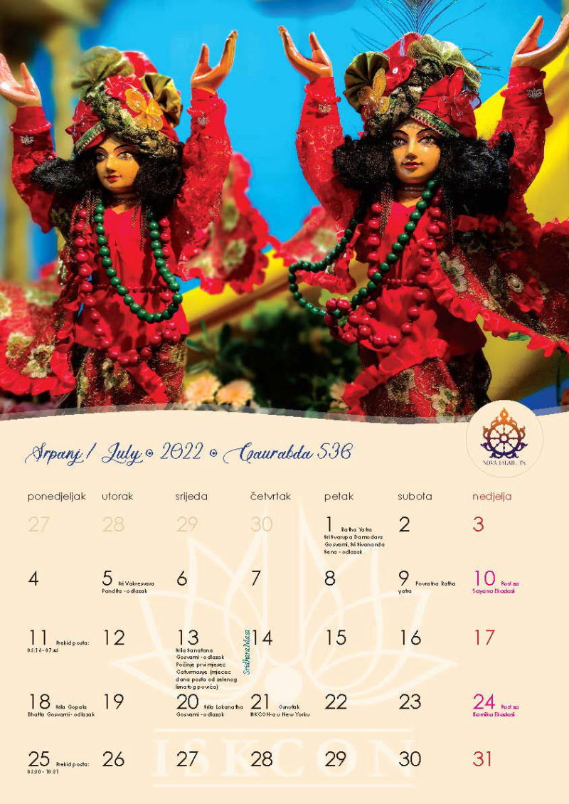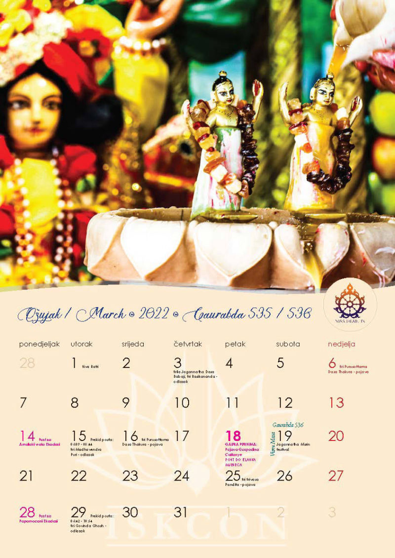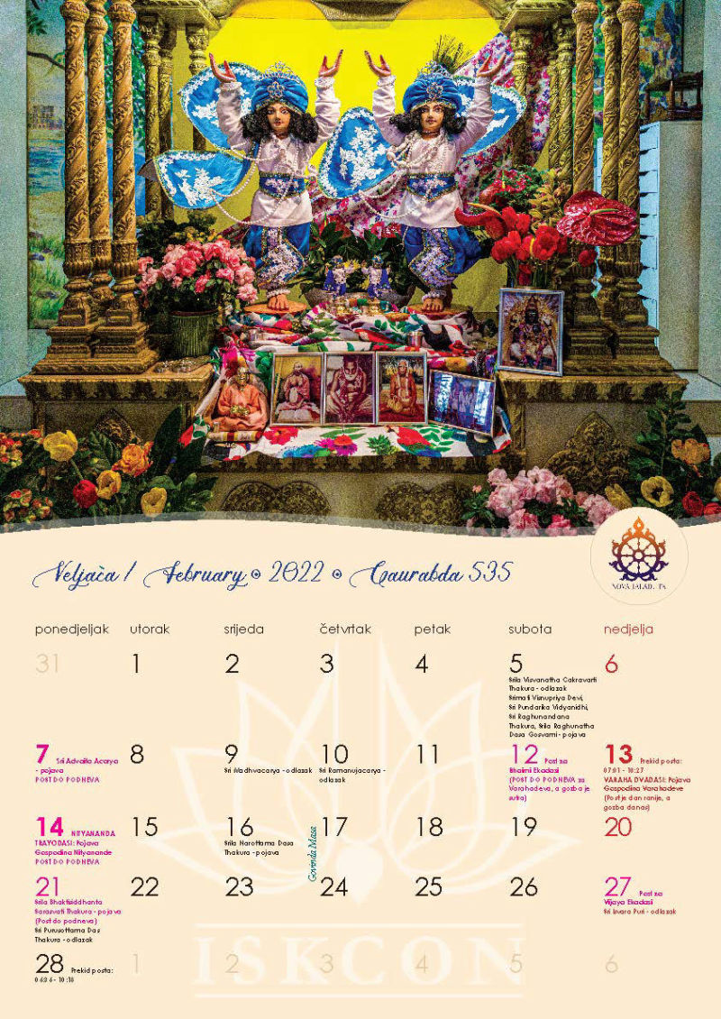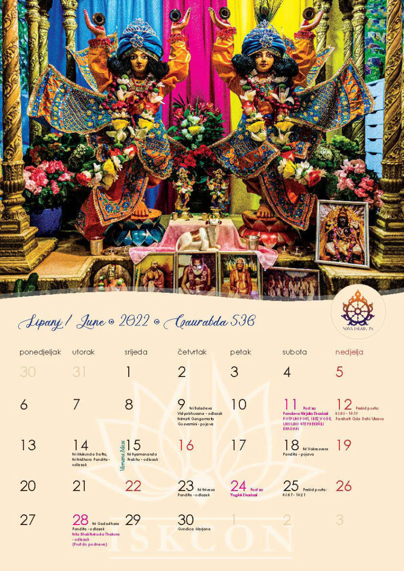 Novi kalendar za 2022. godinu s motivima naših prekrasnih Sri Sri Gaura Nitai te svim značajnim datumima koje vaišnave obilježavaju, napokon je izašao iz tiska i možete ga preuzeti u zagrebačkom hramu ili naručiti poštom, ako već niste.