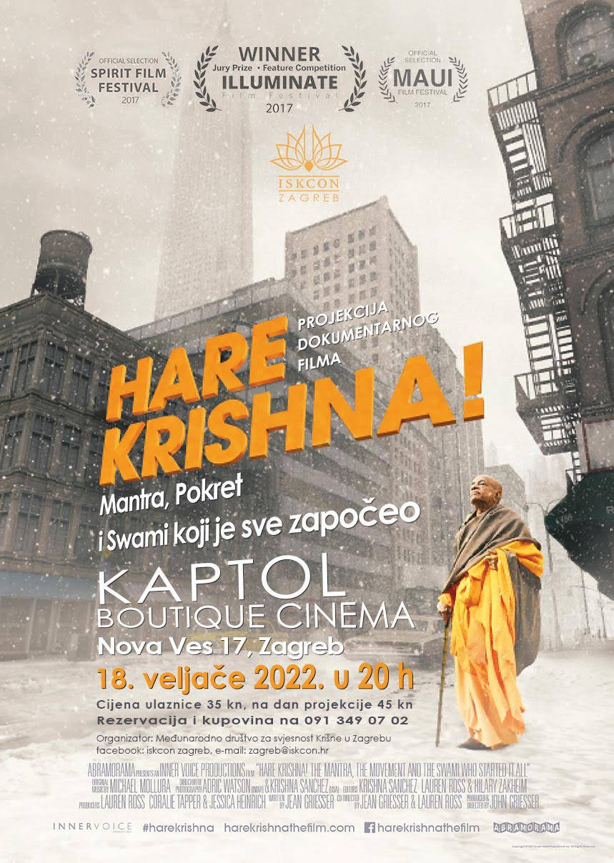 Nakon dvije godine, u Kinu Kaptol, 60-ak gostiju ponovno je imalo priliku pogledati projekciju dokumentarnog filma o životu i djelu Srila Prabhupade, pod nazivom 'Hare Krishna! Mantra, Pokret i Swami koji je sve započeo'. Ugodno nas je iznenadio značajan broj posjetitelja koji su tom prilikom po prvi puta posjetili naš program.